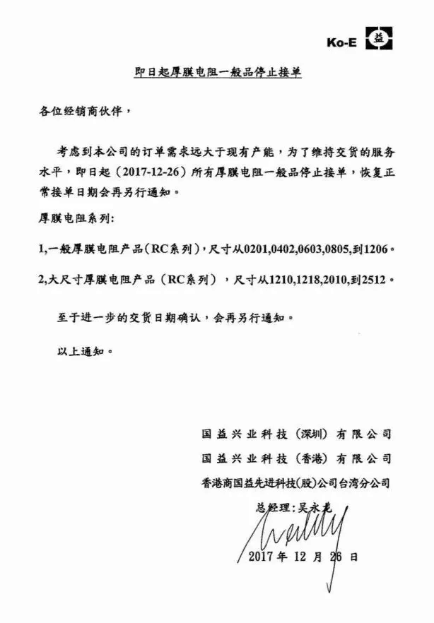 作为全球第二大电阻制造商,台湾大毅科技(苏州)厂在今年7月10日发布涨价通知,由于各项成本(包含运费)及人工成本持续增加,即日起暂停0603-1206芯片电阻产品的接单,待检讨售价后才恢复接单。